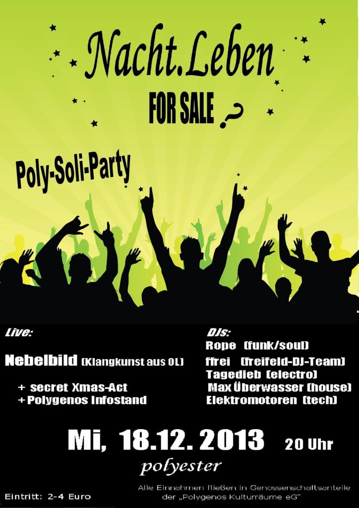 Die Poly-Soli-Party („Nacht.Leben for Sale?“). Ein Abend voll tanzbarer Livemusic und DJ-Zelebration zu Gunsten der Polygenos-Genossenschaft erwartet euch ab 20 Uhr im Polyester.