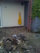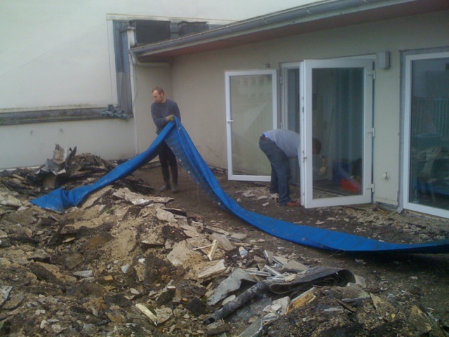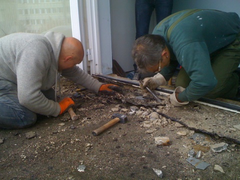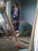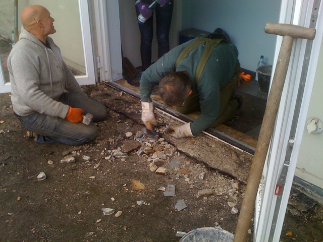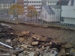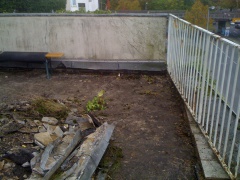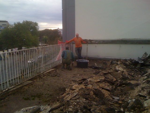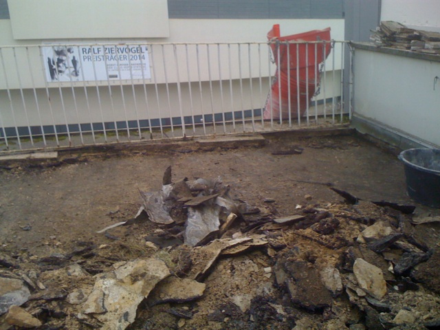 Am letzten Wochenende hat die Anpackergruppe mit den notwendigen Vorarbeiten für die Außensanierung des Polyhauses begonnen. Um die Bausubstanz zu erhalten, ist die Abdichtung der Dachterrasse im Moment das Wichtigste. Damit der Dachdecker die Abdichtarbeiten vornehmen kann, muss der alte Belag der Dachterrasse abgetragen werden.