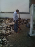 Die Bodenplatten lassen sich erstaunlich schnell mittels eines Spatens hochheben. Der Frost der vergangenen Jahre hatte schon vorgearbeitet. Sie stapeln sich im Nu bis auf die Höhe des Geländers. Eine Menschenkette wird gebildet, und allen macht es einen Riesenspaß gezielt Steine mit großem Getöse durch die Schütten zu schmeißen.