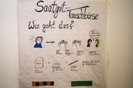 Im Nebenraum fand parallel dazu die Saatguttauschbörse statt. An sechs Tischen konnten Gartenneulinge und „alte Hasen“ über Gartenerfahrungen schnacken und das eigene Saatgutkörbchen durch Tausch bereichern. Die Mentalität des Tauschens und Teilens von Samen und Wissen ist seit jeher Bestandteil der Saatgutzüchter. Durch die vielfältigen Programmpunkte und netten Gespräche verging die Zeit wie im Flug und so mancher ging beglückt nach Hause um zum Beispiel Zitronenbasilikum und Matador-Spinat auf seiner Fensterbank zu säen.