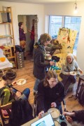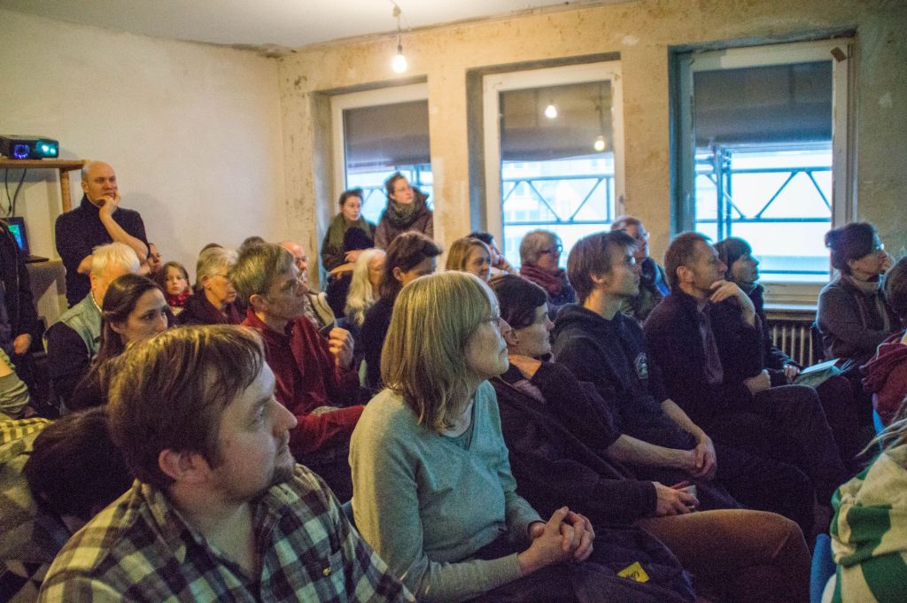 Bereits ab Viertel vor Drei strömten die ersten Besucher ins Haus, um im zweiten Obergeschoss Saatgut zu tauschen oder im dritten Kaffee und Kuchen zu genießen und sich über die Polygenos-Schindelaktion zu informieren. Die Werbung war anscheinend erfolgreich – mindestens 80 Menschen fanden sich zu den unterschiedlichen Programmpunkten ein. Ab 15:45 Uhr hielt Saatgutexperte Reinhard Lühring einen faszinierenden Vortrag über die mühselige, aber spannende Züchtung und Erhaltung von alten Saatgutlinien von heimischen Gemüsesorten wie Grünkohl oder auch Zuckererbsen. Ein Thema, das anscheinend auf großes Interesse traf. Es drängten sich knapp 40 Menschen auf ebenso viele Quadratmeter. Ab 17 Uhr stellten sich die Urban-Gardening-Initiativen Wurzelwerk und Bunkergarten sowie der NABU-Wildbienengarten vor.